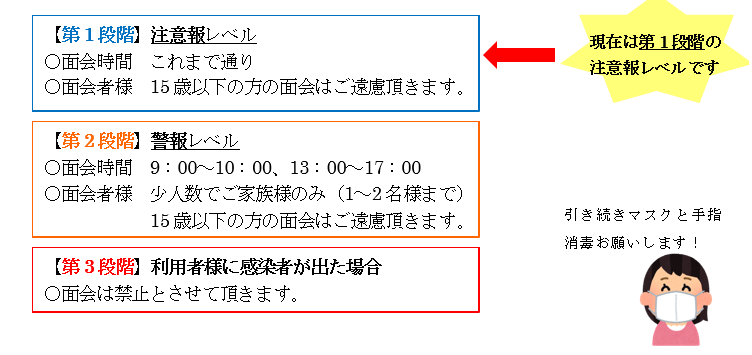 利用者様への感染予防の為に日頃からご家族の皆さまにはマスクや手指消毒にご協力頂き誠にありがとうございます。 当施設ではインフルエンザ感染症情報(※1インフルエンザ流行レベルマップ)を参考にしながら面会制限を3段階に分けて設定させて頂きます。利用者の皆さま、ご家族の皆さまにはご迷惑をおかけしますが、ご理解ご協力をお願い致します。