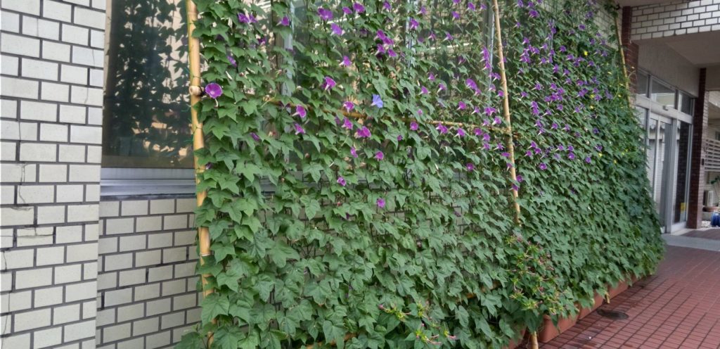玄関横に縦3.2m、横5.6mの大きさで地球温暖化のため、できるだけ早期に緑の茂みをと6月上旬に窓一面を覆うように育てました。