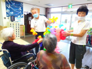昨年度はコロナ禍で皆さんにお会いできず、大変寂しい思いをしました。早くこの状況が終息し、元の生活に戻るとよいですね。というお手紙が添えられておりました。利用者も風船で作られた大きなかごに入った作品を見てとても喜ばれ、それぞれ子犬のバルーンを持って楽しんでおられました。コロナ禍で行事やボランティアの皆さんの訪問も出来ない中で楽しいバルーンアートに利用者、職員一同、とても和みました。