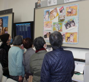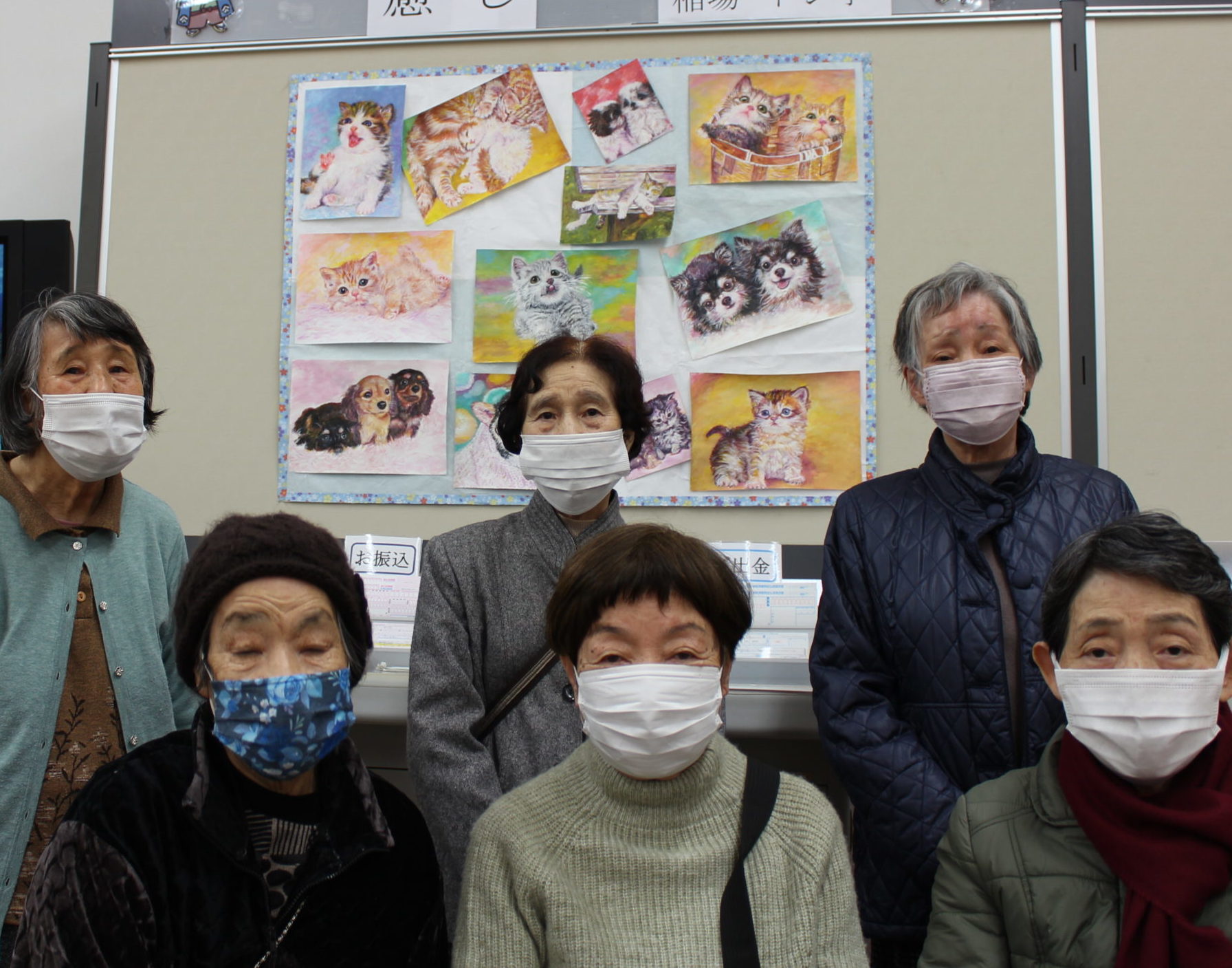北陸銀行魚津支店様のご厚意により、ギャラリーに利用者さんが1年かけて製作した、猫や犬の絵画を展示させていただきました。「癒し」とのタイトルで可愛い子猫や子犬の描写絵で、見ておられた方々が口を揃えて「かわいい」と、まさに”癒し”になっておられました。