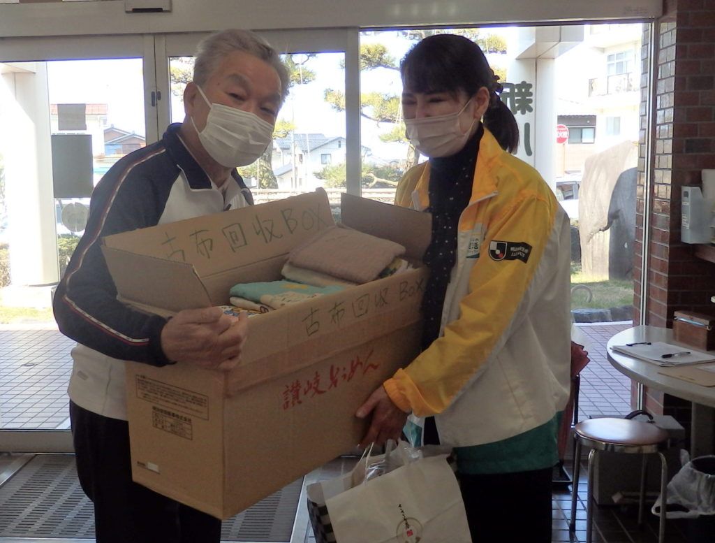 明治安田生命の魚津営業所(小林 充所長)の職員のみなさんが家庭から持ち寄った古タオル300枚が新川ヴィーラに寄贈されました。特別養護老人ホームの新川ヴィーラでは、食事の介助の時などにタオルを多く使うことから、これまでも明治安田生命から寄付していただいていました。魚津営業所の窪田美千代さんから目だ一朗施設長に手渡されました。施設では、さっそく各フロアに配り役立てることにしています。