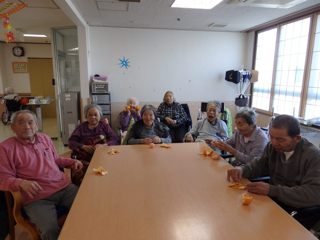 11月21日、富山県善意銀行から、みかん箱の寄付をいただき、新川ヴィーラ入居者様に召し上がっていただきました。入居者の皆様は「おいしい、おいしい」といってペロリと召し上がられました。