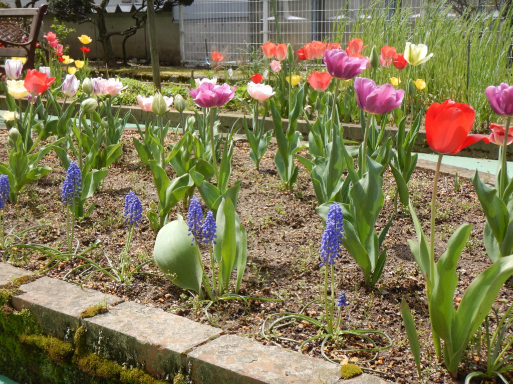 秋にみんなで植えた球根のチューリップやムスカリ、