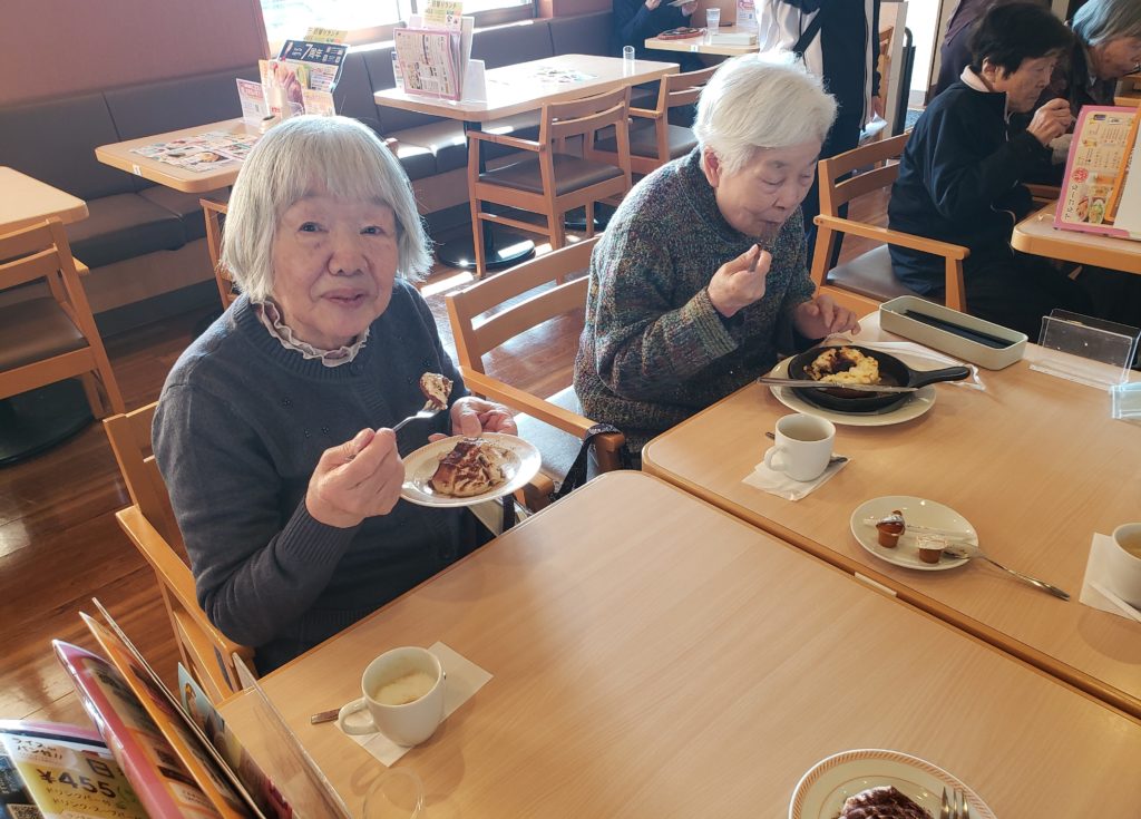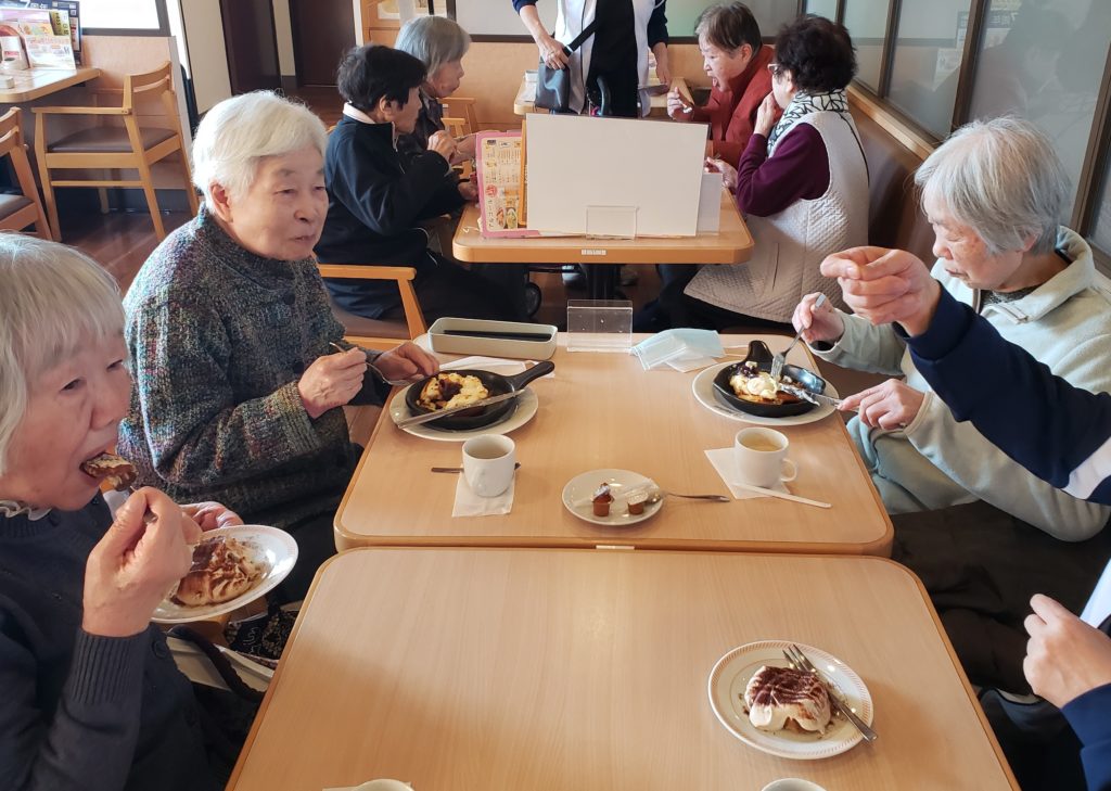 毎月施設内で開催している「カフェ団らん」を、少し気分を変えて「お出かけカフェ団らん」として開催しました。みんなでジャンボタクシーに乗って、ファミリーレストランへ。いつもと違う雰囲気の中で、コーヒーやデザートをゆっくり楽しみました。