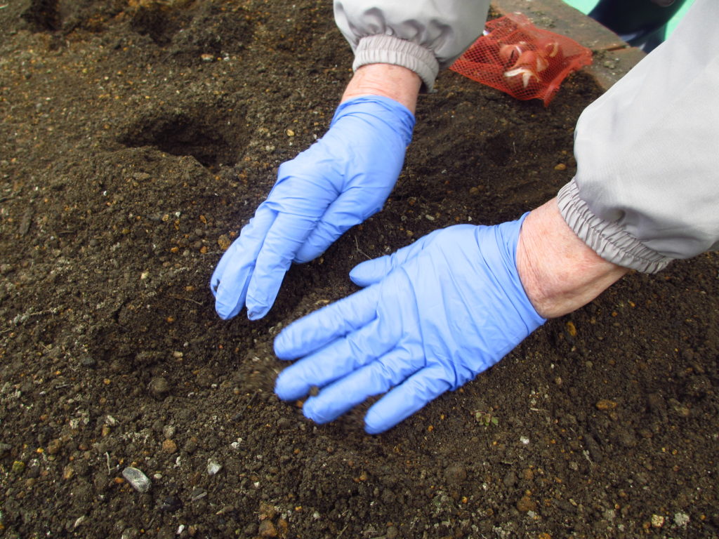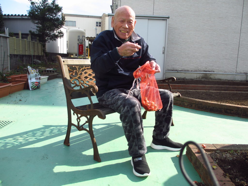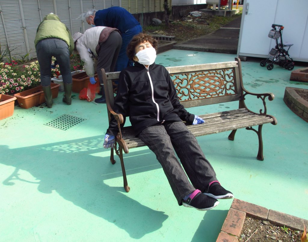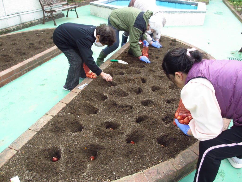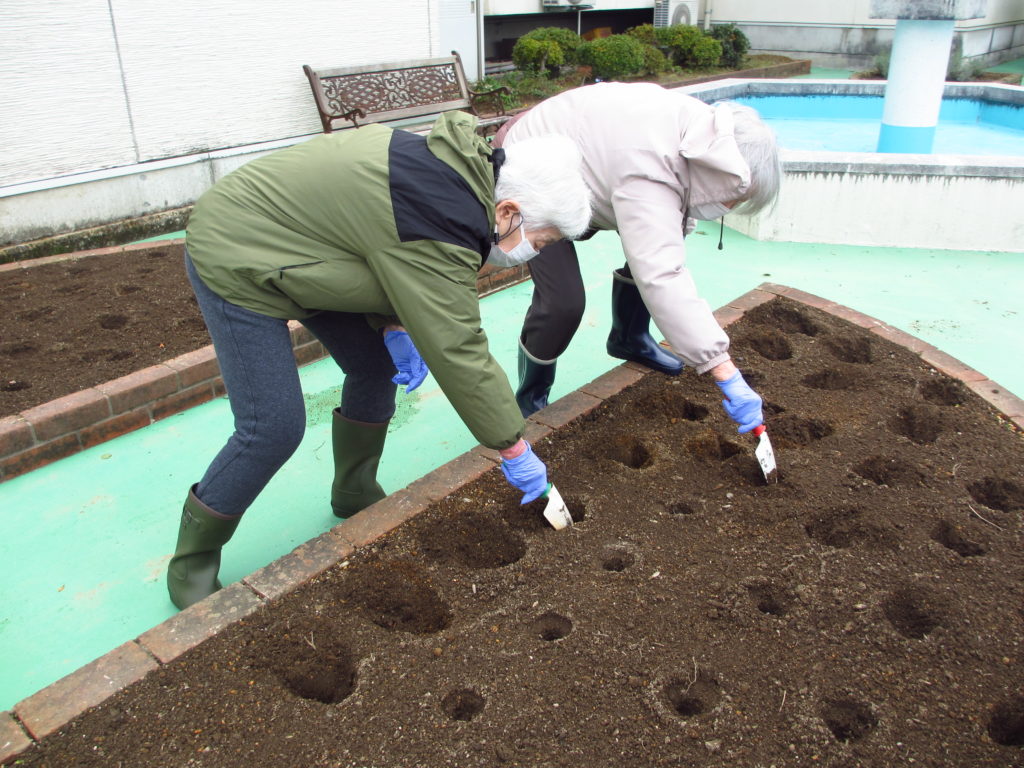 11月某日、来年の春も皆で花を楽しめるように、入居者の皆さんと一緒に花壇を耕し、