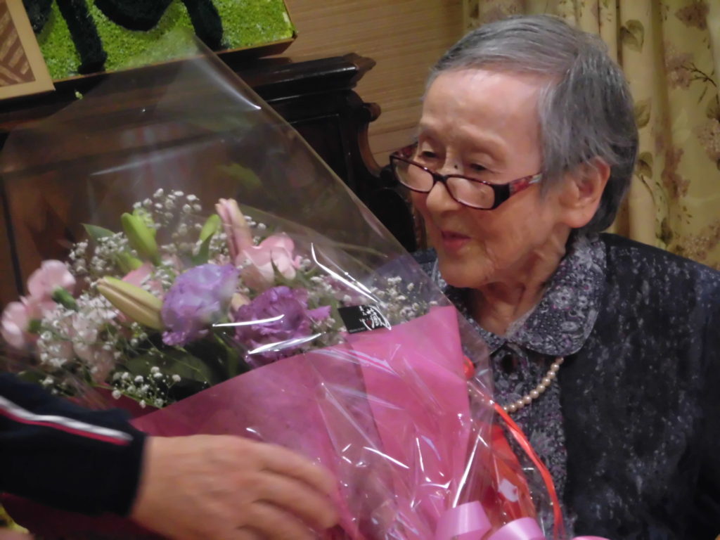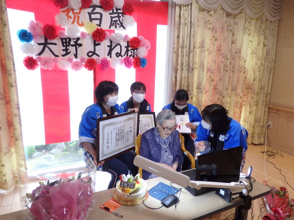 大正9年生まれの大野よねさんは、新川ヴィーラ東館でめでたく100歳を迎えました。よねさんの100歳を祝って村椿晃魚津市長がテレビ電話(スカイプ)で、話しかけました。よねさんは、「若いころから踊りや劇がみんなとしていました。歌を唄うのも大好きです。」と、元気な声で答えていました。よねさんは、高岡市生まれで8人姉妹の末っ子で昭和19年から魚津市で暮らしています。「お話しするのが楽しみです。」と話して、入所者からお祝いを受けていました。